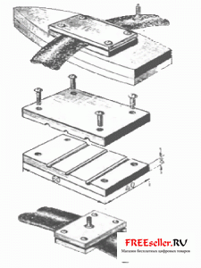 Для работы, кроме вулканизационной (сырой) резины из вело-мото аптечки, потребуется несложная пресс-форма, которая делается из двух стальных пластин толщиной 6-8 мм и размером 40X60 мм. По углам просверливают четыре отверстия и нарезают резьбу М4 для стягивания половин винтами. Внутренние кромки пластин слегка стачиваются, чтобы края не врезались в резину. В случае сложной конфигурации ремонтируемых деталей пластинам придают соответствующую форму или делают дополнительные отверстия и канавки.
