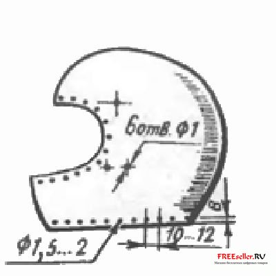 Следующий этап - сборка «интеграла». Сначала по периметру нижней и передней частей шлема сверлится цепочка отверстий 01,5 мм. Расстояние между отверстиями - 10 мм, а от обреза шлема - 7-8 мм. Далее размечаются шесть отверстий для крепления защитного стекла и ремней. Отверстия под стекло размечаются таким образом, чтобы оно поднималось до положения, указанного на рисунке. Если шлем предназначен для мотоциклиста, то вместо 4 отверстий для крепления стекла на шлеме на уровне лба разделываются три отверстия под ответные части кнопок козырька и два - для крепления ремней. Расположение отверстий рассчитайте так, чтобы козырек не загораживал гонщику поле зрения. Ответные части кнопок можно закрепить болтами М4 с потайной головкой. После установки крепежа внутренняя часть «скорлупы» оклеивается кусочками мягкого пенопласта 40Х 40Х 20 мм, для чего воспользуйтесь клеем «88». Толщина брусков зависит от размеров головы гонщика. Наклеивать пенопласт необходимо, отступая от кромок шлема на 15 мм,- пришивать подкладку будет гораздо удобнее.