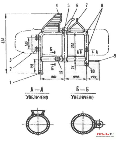1, 10 - кронштейн крепления к мотороллеру, 2 - передняя опора люльки, 3 - люлька, 4 - подножка, 5 - труба с торсионом, 6 - рычаг подвески колеса, 7 - ось под верхнюю головки амортизатора колеса, 8 - опоры пружин, 9 - кронштейн крепления глушителя, 11 - ухо крепления тяги коляски.