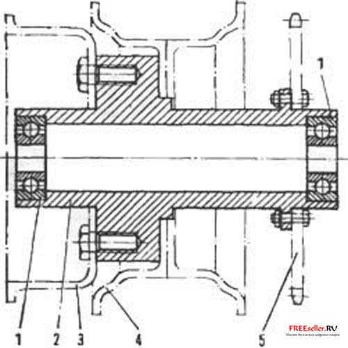 1 - подшипники № 203, 2 - ступица, 3 тормозной барабан, 4 - диск колеса, 5 - звездочка.