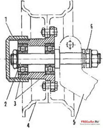 1 - заглушка, 2 - ось, 3 - подшипники № 203, 4 - диск колеса, 5 - рычаг подвески, 6 - головка амортизатора.