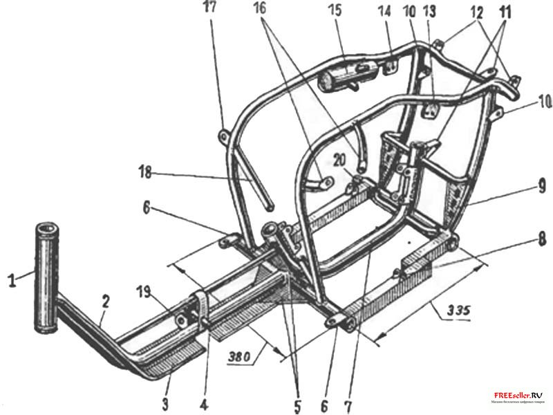 1 - втулка рулевой колонки, 2 - труба, 3 - опора пола, 4 - ось педалей, 5 -косынки, 6 - петли крепления пола, 7 -под моторная рама, 8 - держатель капота, 9 узел подвески задней вилки, 10 - кронштейны крепления задних амортизаторов, 11 - петли крепления крыла, 12 - кронштейны для капота, 13 - кронштейн бензонасоса, 14 - кронштейн катушки зажигания, 15 - расходный бачок, 16 - лапки крепления вентилятора, 17 - кронштейн крепления тяги коляски, 18 - подкос, 19, 20 - кронштейны подвески коляски.