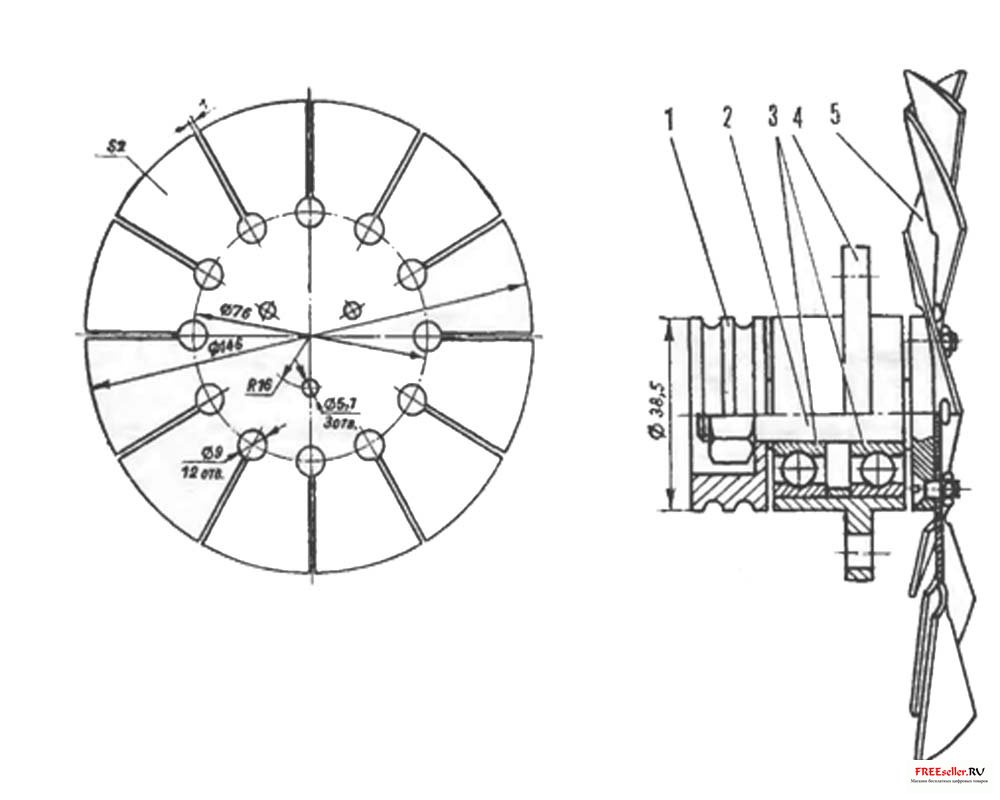 1 - ведомый шкив, 2 - вал, 3 - подшипники № 201, 4 -корпус, 5 - крыльчатка (слева - ее заготовка).