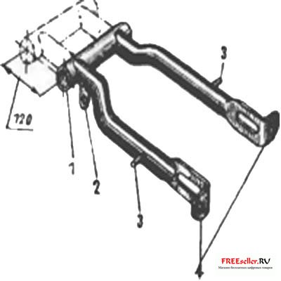 Под моторная рама укреплена поперечными трубами и косынками с отверстиями, в которых подвешивается маятниковая вилка от мотоцикла Иж-56, только укороченная на 120 мм (рис. 2). На ней имеются короткие, консольные закрепленные оси для головок амортизаторов от М-106.