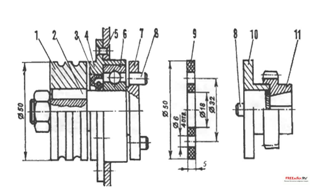 1 - ведущий шкив, 2 - шпонка, 3 - манжета, 4 - корпус, 5 - стенка коробки передач, 6 - подшипник № 204, 7 - диск левой полумуфты с валом, 8 - штифты (4 шт.), 9 - текстолитовая шайба, 10 - правая полумуфта, 11 - шестерня коробки передач.