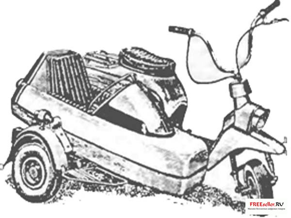 Люлька коляски контактирует с рамой передней опорой и двумя спиральными пружинами сзади. Ушки передней опоры с вилками на раме соединены через конические резиновые втулки болтами. Корпус люльки сделан из четырех передних и четырех задних крыльев старого кузова «Жигулей». Обтекатель - из переднего капота мотоколяски СЗА. Соединяли детали, отбортовав края газовой сваркой. Потом зачищали, грунтовали, шпаклевали и красили. Сиденья как в люльке, так и на мотороллере переделали из сидений «Москвича-412».За спиной сиденья в люльке расположен топливный бак размером 320 х 200 х 80 мм емкостью пять литров. Его горловина от «Москвича-408» выведена на заднюю стенку люльки и закрыта крышкой. Топливо к насосу и обратно - из расходного бачка - идет по двум бензостойким шлангам.