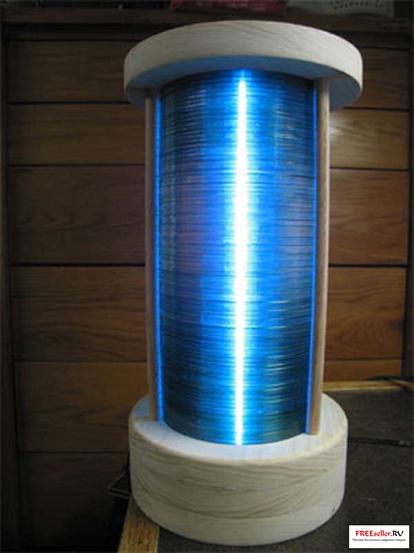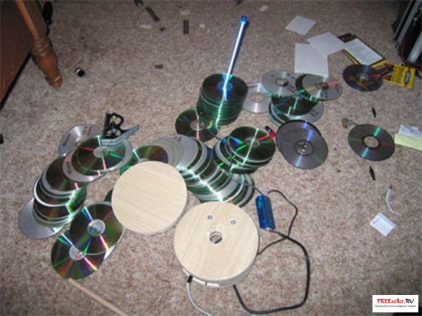 Очень красивый светильник ночник можно сделать из старых CD дисков, которые нанизываются на тонкую вытянутую лампу, установленную в выточенные на токарном станке деревянные кружочки (сверху и снизу).