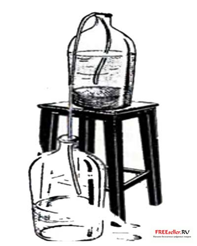 Еще приблизительно две недели уйдет на осветление сусла. А когда на дне бутыли появится белесый осадок из завершивших свою работу винных дрожжей, необходимо приступить к снятию сока с осадка (рис. 6), т. е. к отделению сброженной части сусла - она уже будет носить название вино- материал - от этого осадка. Теперь пришло время задействовать шланг, приобретенный в аптеке или взятый у соседа-винодела напрокат.