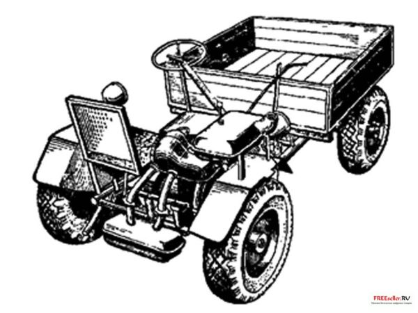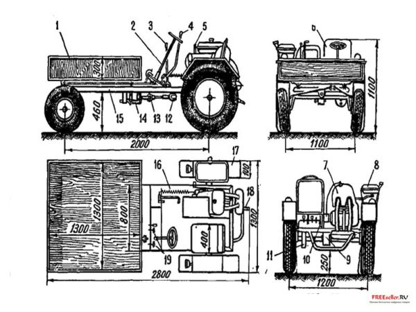 1 - кузов; 2 - рулевая колонка; 3 - рычаги управления; 4 - тормоз; 5 - рычаг переключения передач, 6 - сиденье; 7 - двигатель; 8 - бак; 9 - задний мост; 10 - рычаг управления реверсом; 11 - тормозной барабан; 12 - конические шестерни; 13 - кардан привода редуктора; 14 - редуктор; 15 - рама; 16 - пружина (для облегчения управления платформой); 17 - крыло; 18 - прицепная скоба; 19 - педали управления