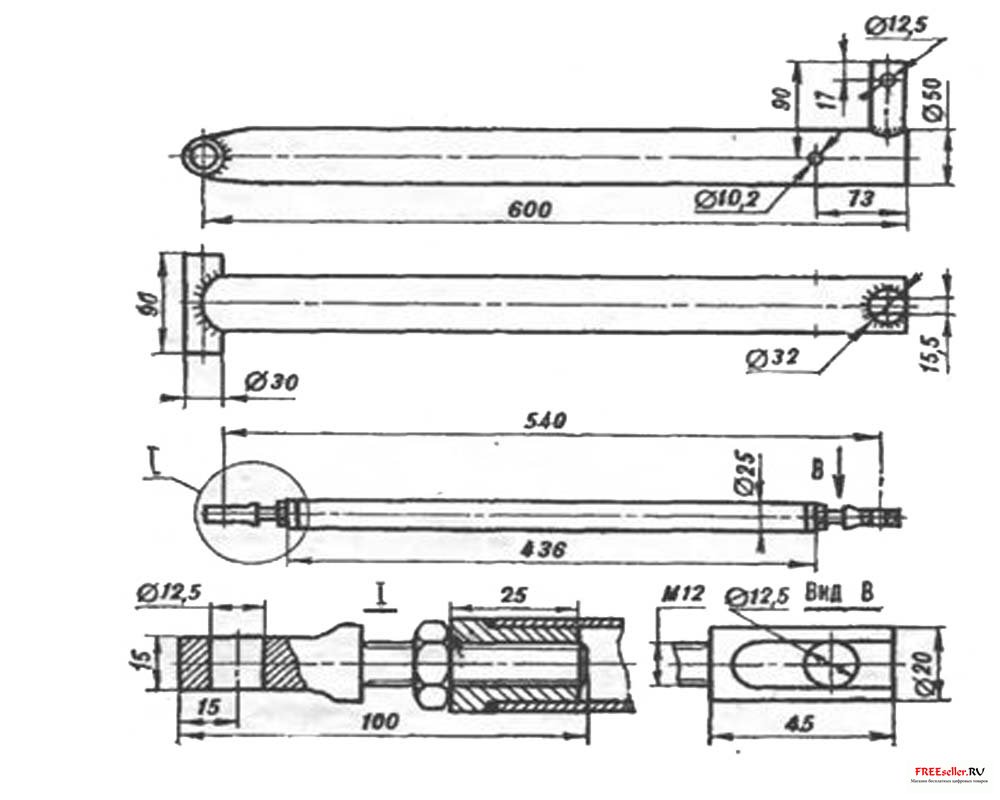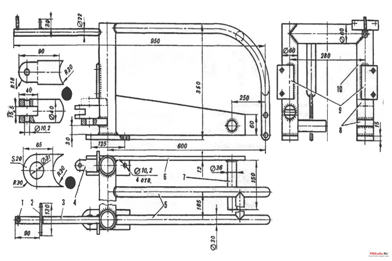 Все остальное изготовлено самостоятельно. Колесная ось выточена на токарном станке. П- образная рама сварена из труб 0 60 мм. Из труб и багажник. Самодельные также три шарнира основной и регулирующей тяги, соединяющих мотоблок с плугом и рулем. Собственной постройки и устройство переключения передач. К раме приварена стальная труба с осью на конце. На оси установлено качающееся коромысло для натяжения тросов, идущих к коробке передач двигателя. Ручка переключения передач - также отрезок трубы, приваренный к коромыслу.