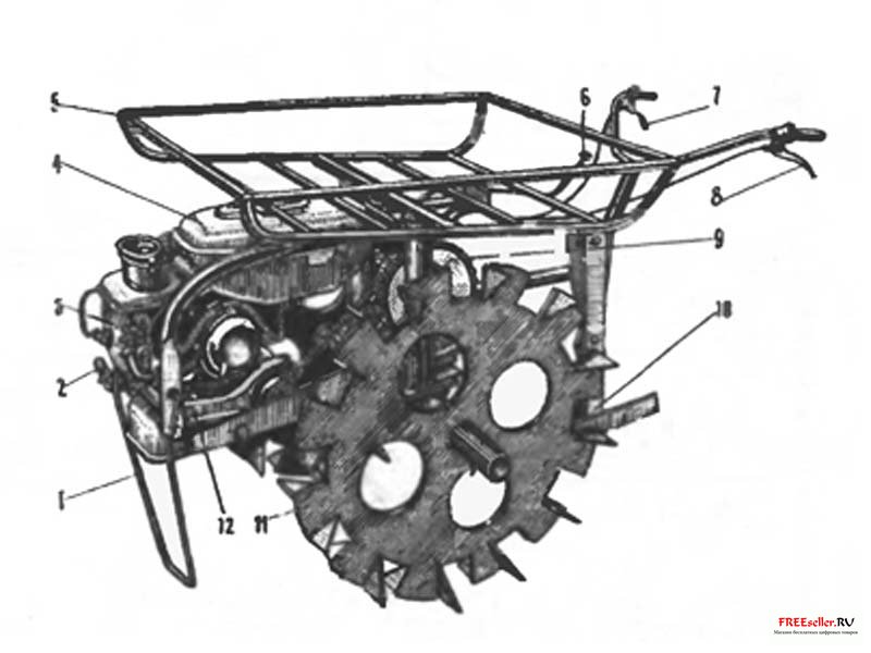 1 - откидная опора, 2 - педаль кикстартера, 3 - двигатель, 4 - топливный бак, 5 - багажник, 6 - рычаг переключения передач, 7 - рычаг сцепления, 8 - рычаг газа, 9 - звездочка вторичного вала, 10 - плуг, 11 - колесо. 12 - подвеска двигателя.