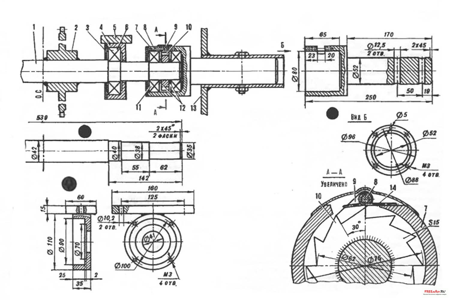 1 - вал, 2 - звездочка, 3 - крышка, 4 - корпус подшипника, 5 - опорная площадка, 6 - подшипник № 308, 7 - корпус обгонной муфты, 8 - ось собачки, 9 - собачка,10 - храповик, 11 - подшипник № 307, 12 - шайбы, 13 - колесо, 14 - пружина собачки.