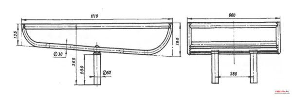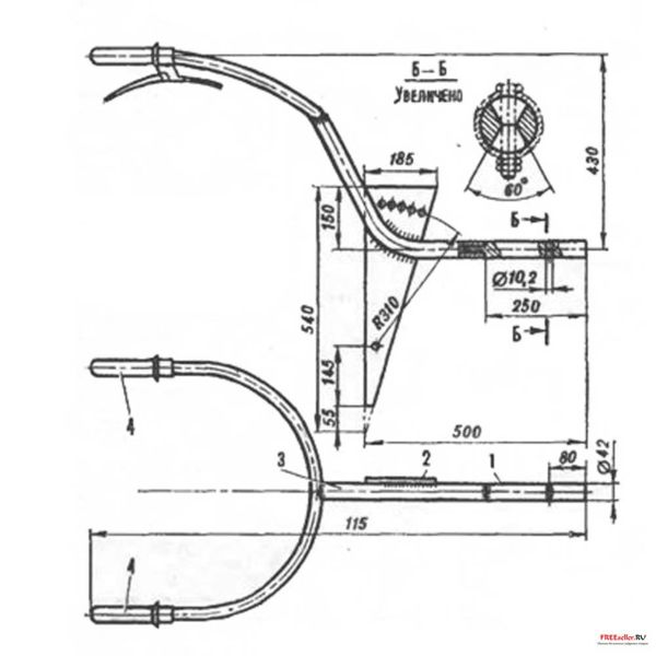 1 - соединительная ось, 2 - планка, 3 - труба, 4 - рукоятки.