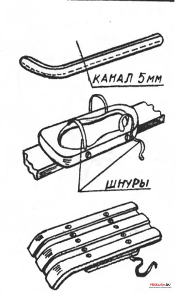 Состоят такие лыжи из нескольких частей. Самое простое - взять ясеневые или буковые доски (размер 70X 1000X 25 мм). Передняя часть будущей лыжи распаривается в кипятке, загибается и таким образом превращается в носок.