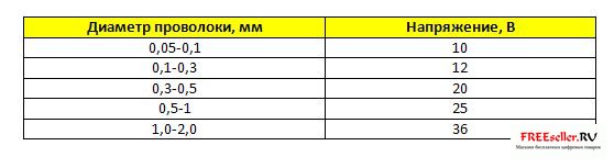 Необходимое напряжение подбирается в зависимости от диаметра свариваемых проводов по таблице