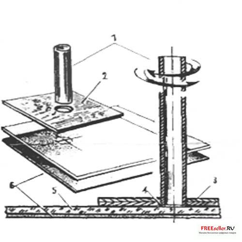 1 - металлическая (медная) трубка, 2,3 - фанерный кондуктор, 4 - наждачный порошок, 5 -просверливаемое стекло, 6 - картонная подкладка.