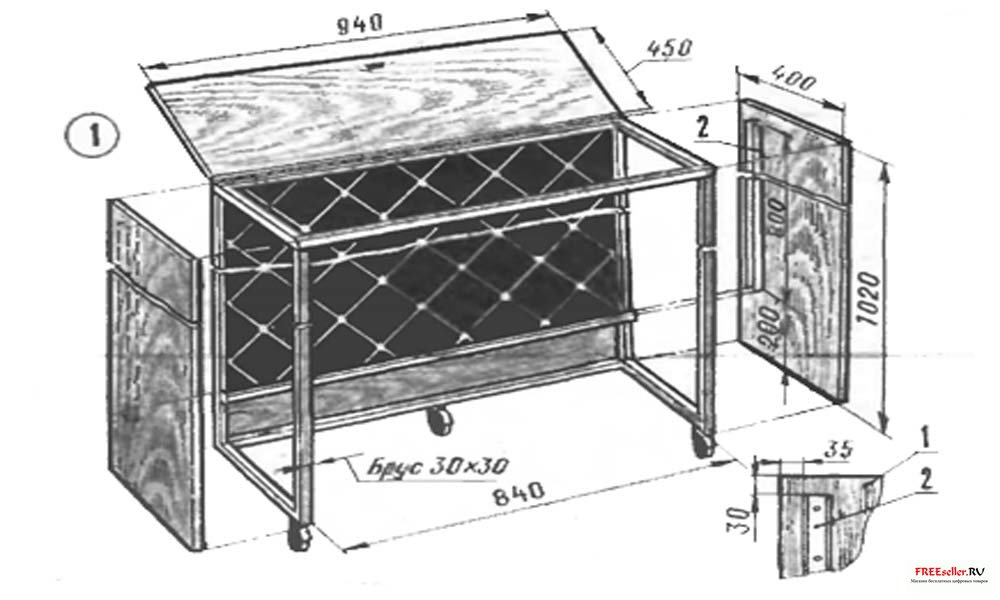 Рис. 3. Узлы и основные детали конструкции самодельной кровати раскладушки в тумбочке: