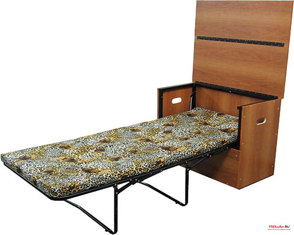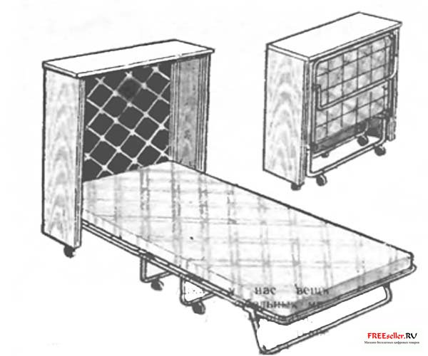 Конструкция самодельной кровати раскладушки в тумбочке очень удобна и практична. Места в комнате занимает мало, может служить универсальным подсобным столиком: для радиоаппаратуры, швейной машины, телефонного аппарата, для сувениров, цветов и др.
