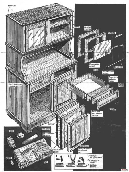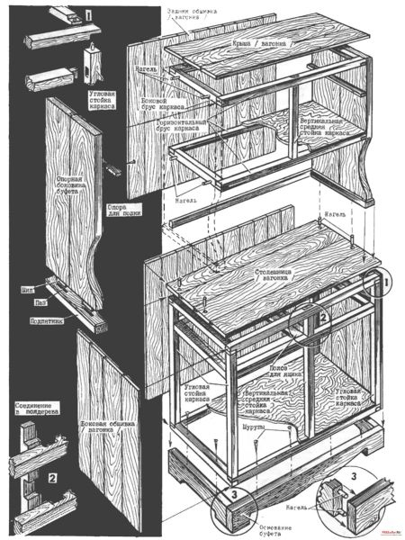 Конструкция, детали, описания сборки и внешний вид буфета показаны на рисунках.
