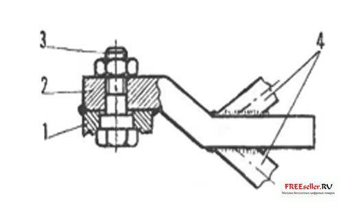 1 - зубчатая шайба, 2 - планка, 3 - монтажный болт, 4 - трубы.