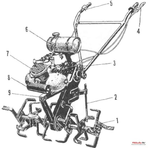 1 - фреза, 2 - задняя опора, 3 - кикстартер, 4 - рычаг сцепления, 5 - рычаг газа, 6 - топливный бак, 7 - двигатель, 8 - глушитель, 9 - рама.