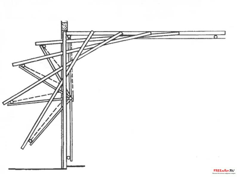 Предлагаемые им ворота имеют одну створку, снабженную устройством, поднимающим ее вверх: в этом положении она располагается параллельно потолку. При подъеме ее не приходится прикладывать больших усилий, так как масса ворот компенсируется двумя цилиндрическими пружинами. Подъем створки осуществляется с помощью системы рычагов с пружинами и роликов, откатывающихся по направляющим рельсам. При этом нижний край, совершая движение по дуге, оказывается обращенным наружу, а верхний, откатываясь по направляющим, уходит внутрь. Вместе с перемещением створки изменяется, и состояние компенсирующих пружин оказывается обращенным наружу, а верхний, откатываясь по направляющим, уходит внутрь. Вместе с перемещением створки, изменяется состояние компенсирующих пружин. В закрытом положении ворот они растянуты, в открытом - почти свободны.