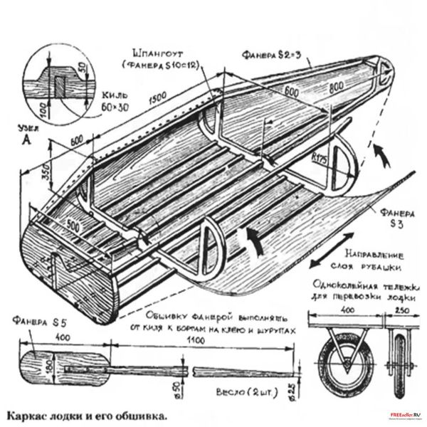 Самодельная деревянная лодка баул делается из листа фанеры, нескольких сосновых планок, полкилограмма эпоксидного или казеинового клея. Вот все, что нужно для ее изготовления. Грузоподъемность «малютки» такова, что позволяет вдвоем совершать небольшие прогулки, ловить рыбу и охотиться. Лодка свободно размещается на багажнике автомобиля, а для ее транспортировки вручную предусмотрена миниатюрная тележка на одном колесе от детского самоката.