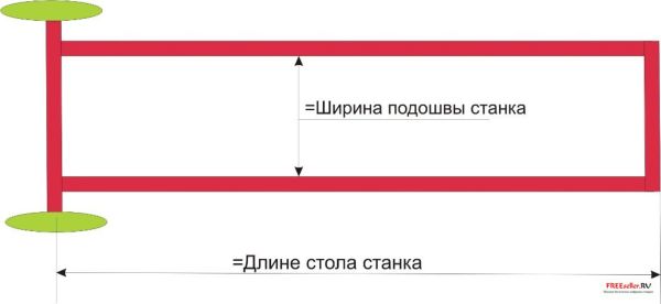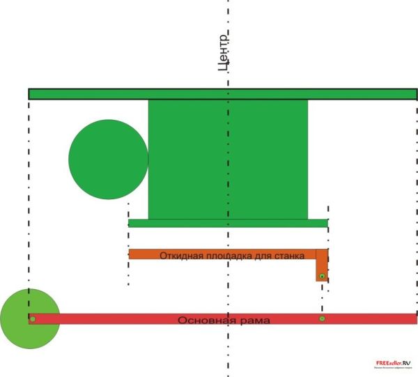 Центр подошвы станка совпадает с центром основной рамы. Точные размеры указывать не стану, так как сегодня на рынках предлагают великое множество станков, габариты которых сильно разняться.
