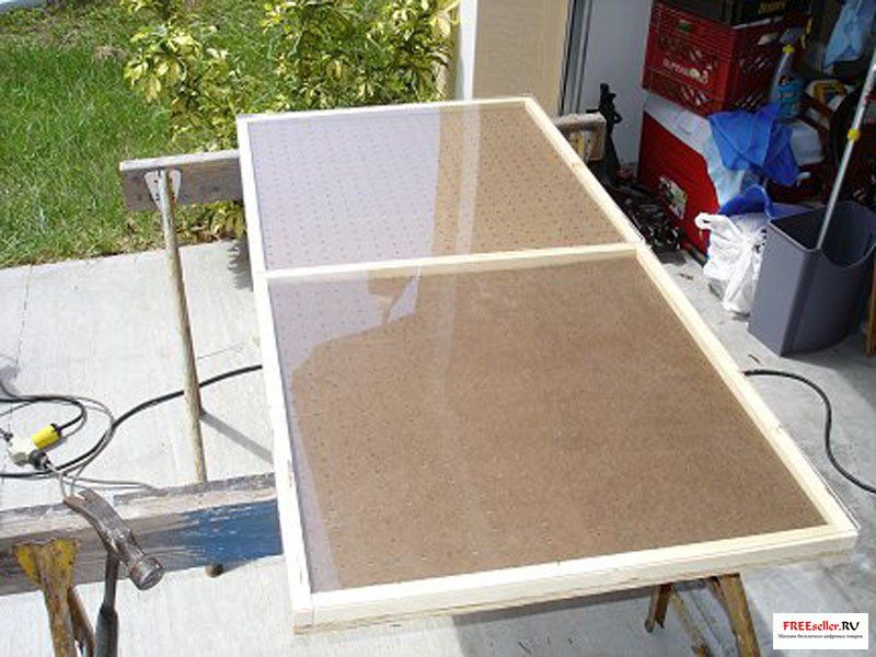 Далее вырезаем два подходящих по размеру куска ДВП. Они будут служить подложками, на которых будут собираться солнечные элементы. Они должны свободно помещаться между бортиками.