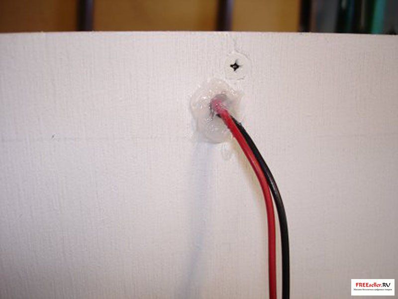Сверлим отверстие в днище батареи ближе к верху, чтобы вывести провода наружу. Провода завязаны на узел, чтобы предотвратить их вытягивание из батареи, и закреплены все тем же герметиком.