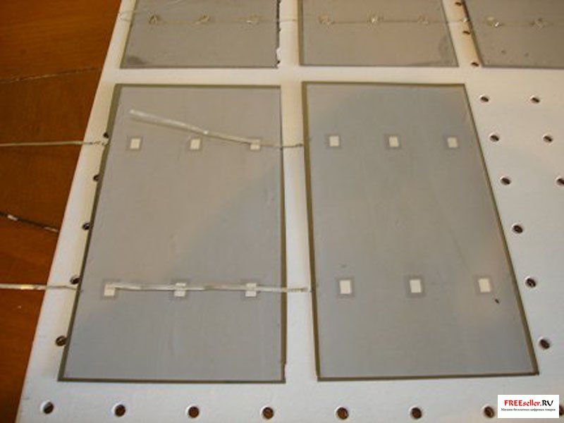 Выкладываем элементы по этой сетке обратной стороной вверх, так их можно спаять вместе. Все 18 элементов для каждой половины батареи должны быть соединены последовательно, после чего обе половины также должны быть соединены последовательно для получения требуемого напряжения.