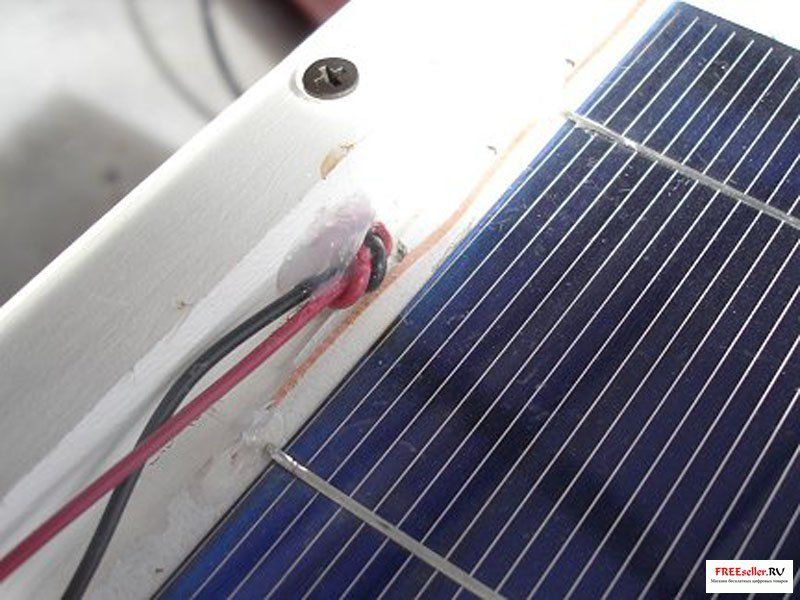 Можно использовать специальные шины или даже обычные провода. Просто у меня под рукой была медная оплетка от кабеля. Такое же соединение делаем с обратной стороны между второй и третьей цепочкой элементов. Каплей герметика я прикрепил провод к основанию, чтобы он не «гулял» и не гнулся.