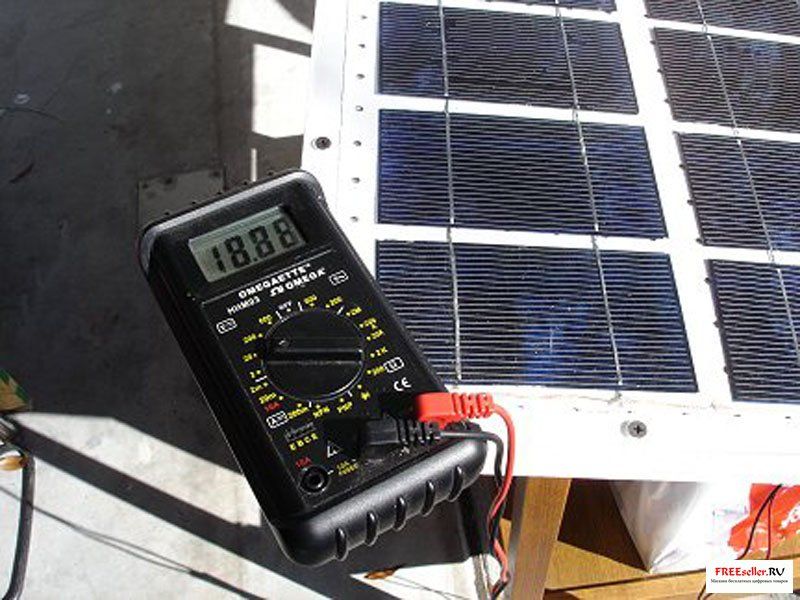 Вот результаты тестирования напряжения законченной батареи на ярком зимнем солнце. Вольтметр показывает 18,88В без нагрузки.