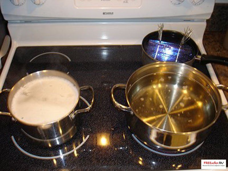 Первая «горячая ванна» для растапливания воска находится на заднем плане справа. На переднем плане слева - горячая мыльная вода, а справа - чистая горячая вода. Температуры во всех кастрюлях ниже температуры кипения воды. Сначала в дальней кастрюле растапливаем воск, переносим элементы по одному в мыльную воду, чтобы удалить остатки воска, после чего промываем в чистой воде.