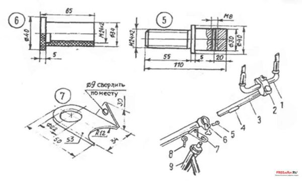 1 - П-образный руль; 2 - хомут руля; 3 - штанга руля, 4 - ребро; 5 - болт М8; 6 - хомут (крепление от седла); 7 -кронштейн; 8 - барашек М8; 9 - рулевая колонка.