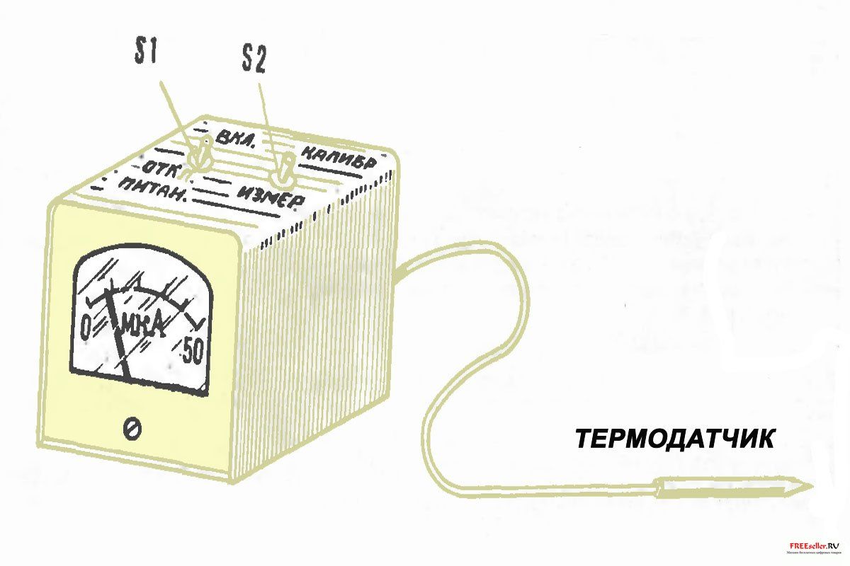 Габариты электрического термометра определяются размерами стрелочного индикатора РА1 и при использовании микроамперметра М4205 0...50 мкА не превышают 85 х 65 х 60 мм (рис. 2).
