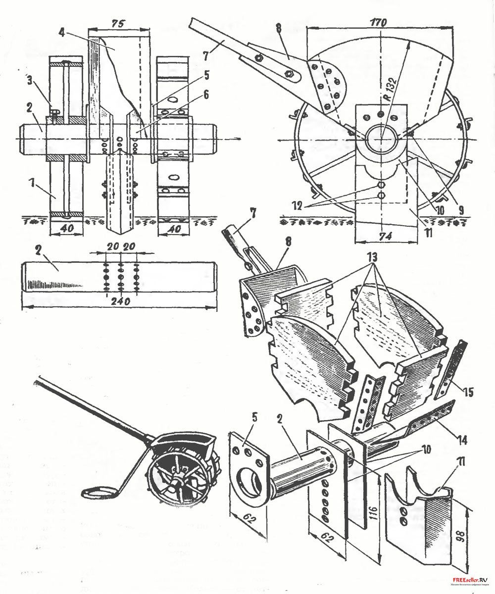 1 - колесо; 2 - высевающий валик; 3 - стопорный болт; 4 - семенной ящик; 5 - подшипник; 6 - деревянная накладка; 7 - ручка; 8 - кронштейн ручки; 9 - резиновые пластинки; 10 - кронштейн сошника; 11 - сошник; 12 - болты крепления сошнинка; 13 - стенки семейного ящика; 14 - наклонное донышко; 15 - стальной угольник.<