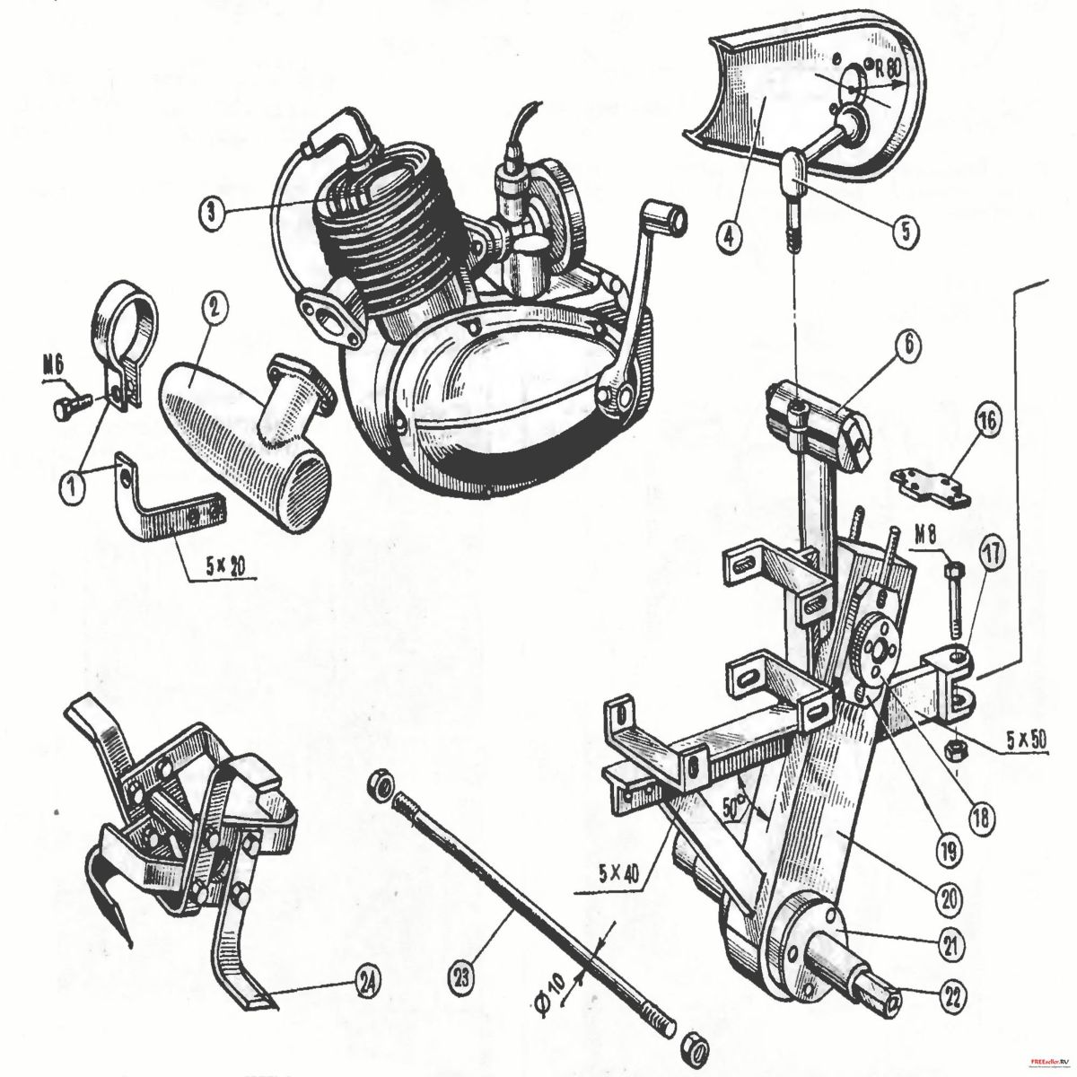 Конструкция несложной самодельной мотофрезы. В качестве силового агрегата для нее можно использовать любой двигатель из серии Ш (Ш-52 Ш-58) с рабочим объемом цилиндра 50 см3.