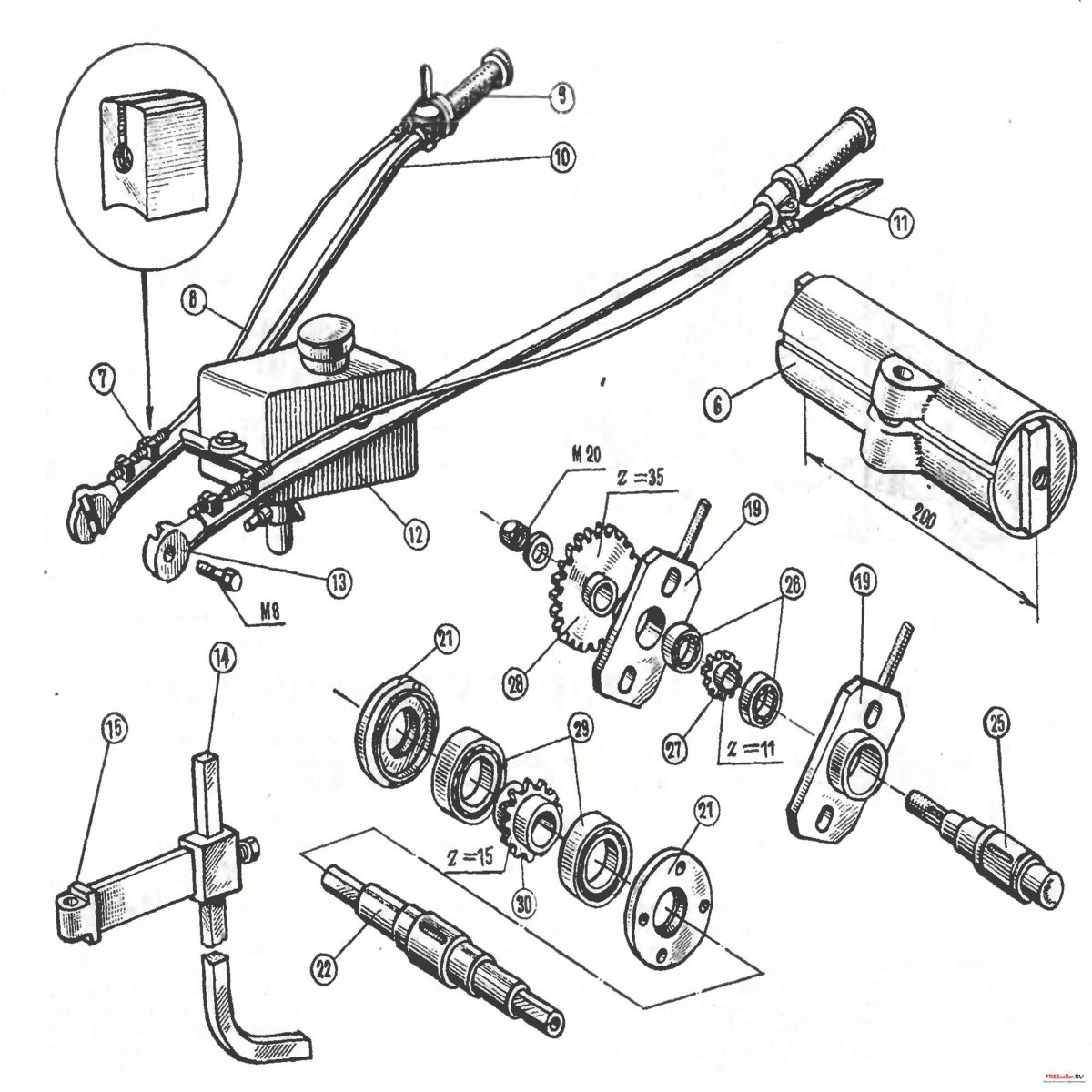 1 - кронштейн крепления глушителя, 2 - глушитель, 3 - двигатель, 4 - защитный кожух цепи, 5 - стопорная рукоятка, 6 - механизм поворота рукояток мотоагрегата, 7 - регулятор натяжения троса управления двигателем, 8 - трос управления, 9 - рукоятка газа, 10 - рукоятка мотоагрегата, 11- рукоятка выключения сцепления, 12 - топливный бак, 13 - переходник, 14 - костыль, 15 - кронштейн, 16 - упорная пластина механизма натяжения цепи, 17 - вилка сцепного устройства, 18,21 - крышки, 19 - корпус подшипника промежуточного вала, 20 - короб рамы, 22 - рабочий вал, 23 - стяжка, 24 - фреза, 25- промежуточный вал, 26 - подшипники 205, 27, 28 - промежуточные звездочки, 29 - подшипники 306, 30 - звездочка рабочего вала.