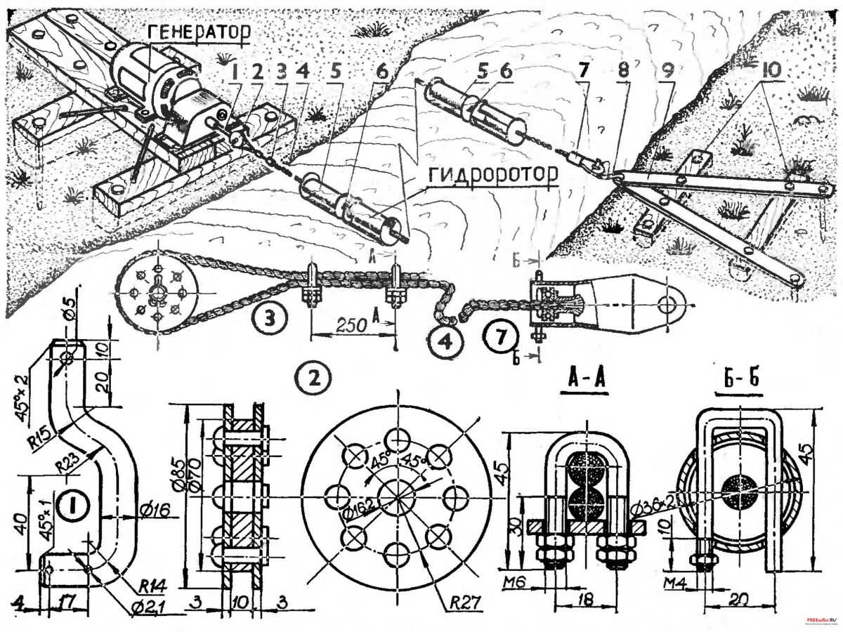 Трос (позиция 4), как вы уже поняли, играет роль гибкого вала. Он металлический, диаметром 10 мм. Его длина должна быть процентов на 10- 15 больше ширины речки. Трос должен иметь законцовки: на одну опирается упорный подшипник, установленный на свободной опоре, через вторую на трос надеваются гидророторы.