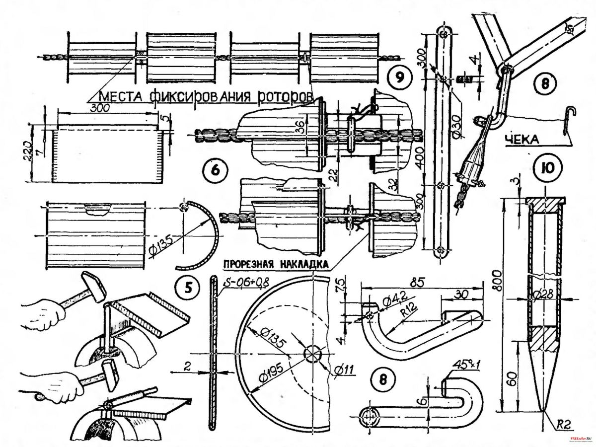 Полуцилиндры и диски скрепите между собой заклепками, винтами или точечной сваркой. Гидророторы готовы. Но прежде чем надевать их на трос, сделайте прорезные накладки и скобы (см. позицию 6).