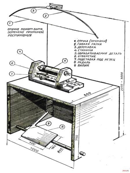 Рис.1. Внешний вид и размеры самодельного токарного станка с ножным приводом