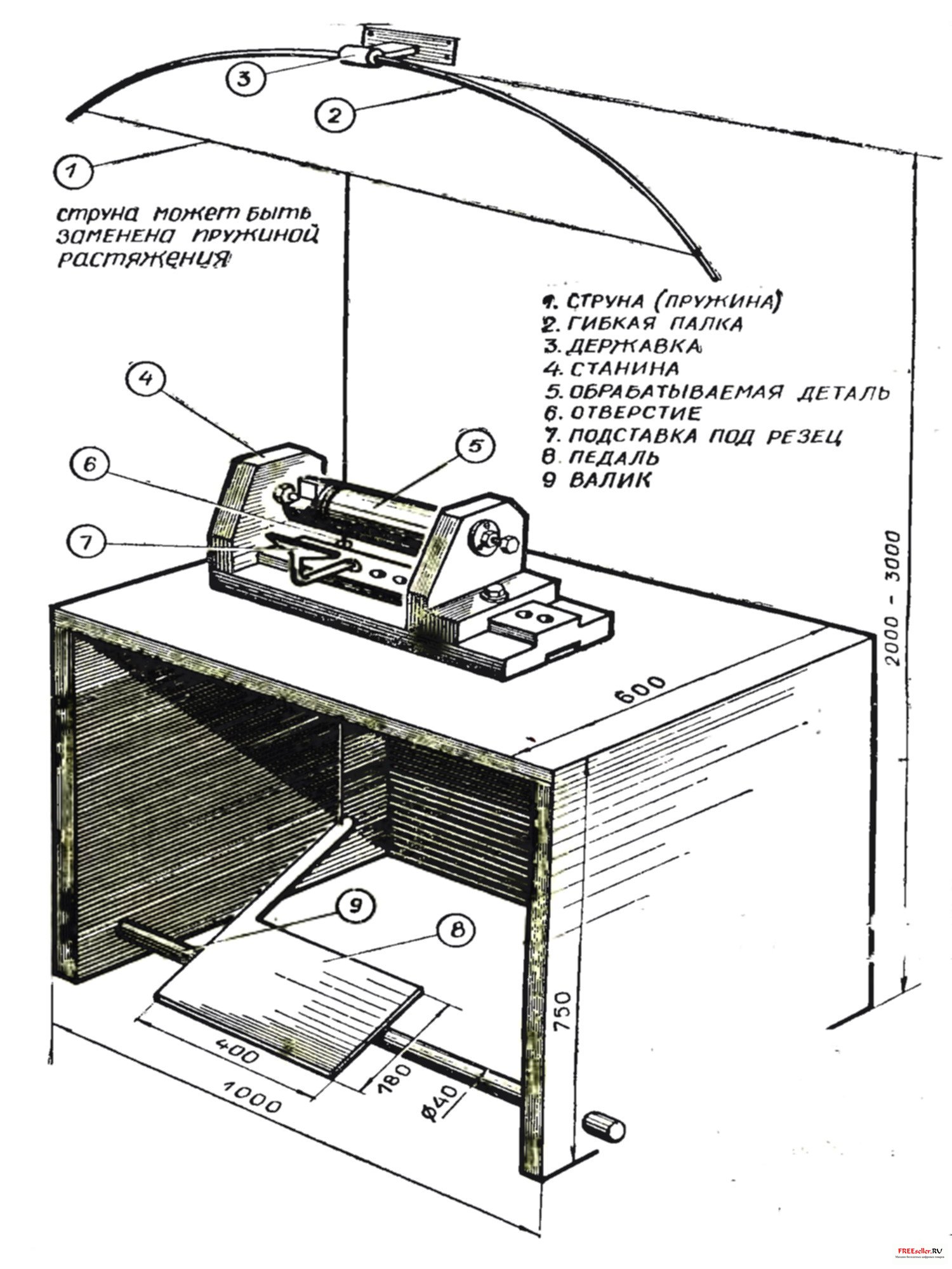 Самодельный токарный станок с ножным приводом - отличная альтернатива современным токарным станкам и может использоваться для изготовления несложных изделий даже там где нет электричества.