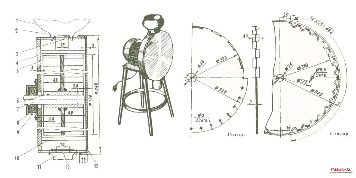 Как показала практика, качество помола зависит от числа оборотов двигателя и, конечно, от величины зазора между ротором и статором. В моей конструкции для обдирки или рушения зерна - зазор 5 мм. Для муки необходимо уменьшить его до 2 мм: надо иметь еще сменный ротор с большим диаметром. Но есть другой выход - изменить схему подключения к двигателю: снять мельницу с вала двигателя и, поставив отдельно, наладить ременную передачу со сменными шкивами, увеличивая (для муки) число оборотов.
