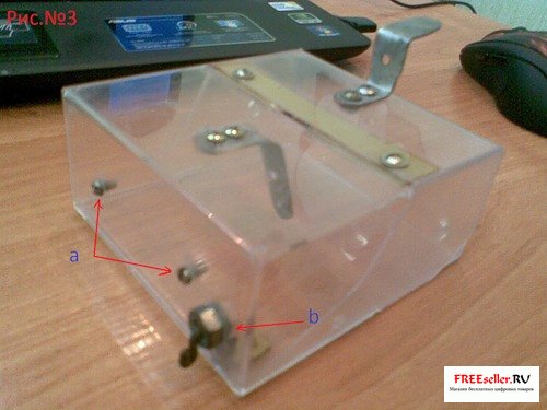 a) Эти болты НЕ являются обязательным элементом в конструкции представленной мышеловки. На месте этих болтов были дыхательные двухмиллиметровые отверстия, но мне пришлось заглушить их болтами, так как пойманная мышь пыталась уцепиться зубками за эти отверстия. Дыхательные отверстия лучше расположить на верхней стороне(крышке) мышеловки. Вообще какие-либо отверстия в данной мышеловке(пластиковом поддискетнике) можно проделать разогрев остриё шила,гвоздя или спицы на горящей свече или газовой конфорке (пластиковые наплывы срезаются ножом).