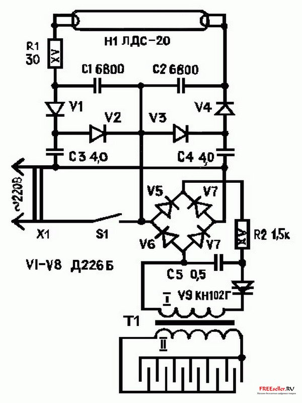 В этой ловушке применена лампа дневного света мощностью 20 Вт. Она включается в сеть через умножитель напряжения, собранный на диодах VI - V4 и конденсаторах С1-С4. Это позволило обойтись без стартера и дросселя - деталей, характерных для обычной схемы включения. Кроме того, для работы теперь пригодна даже лампа с перегоревшими нитями накала - свечение лампы возникает за счет высокого напряжения между ее электродами.