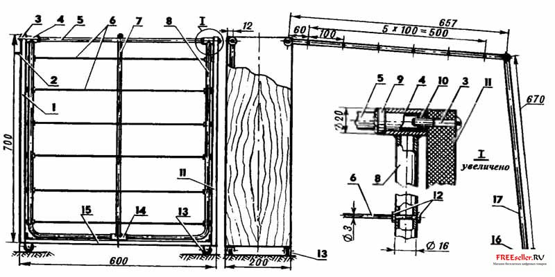 1 - панель передняя (ДСП, s20), 2 - ручка мебельная, 3 - винт М6, 4 - втулка (сталь, труба 22x2), 5 - стяжка (сталь, труба 18x2), 6 - прутья решетки (нержавеющая сталь, пруток диаметром 3, 12 шт.), 7 - опора в убранном положении (сталь, труба 16x1,5), 8 - каркас решетки (сталь, труба 16x1,5), 9 - кольцо-ограничитель (сталь, труба 22x2), 10 - гайка Мб (4 шт.), 11 - панель задняя (ДСП, s20), 12 - гайки МЗ (48 шт.), 13 - колеса мебельные, 14 - втулка (сталь, труба 20x2), 15 -дно (ДСП, s20), 16 - наконечник (полиэтилен), 17 - опора в откинутом положении.