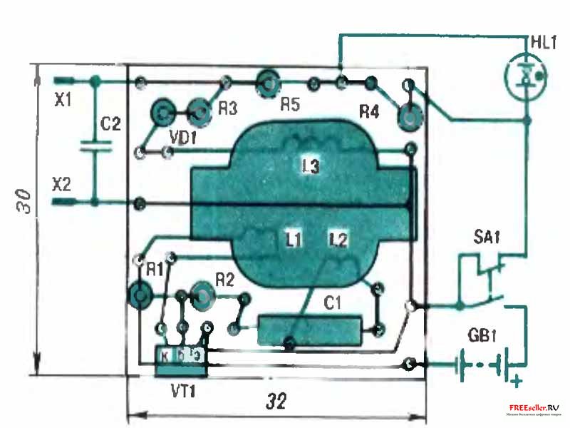 Большая часть схемы монтируется на плате из односторонне фольгированного стеклотекстолита, топография печатных проводников которой и расположение деталей приведены на рис.2. После пайки и проверки сборка покрывается с обеих сторон защитным слоем лака или какого-либо герметика для предотвращения утечки тока в условиях повышенной влажности. ![]()