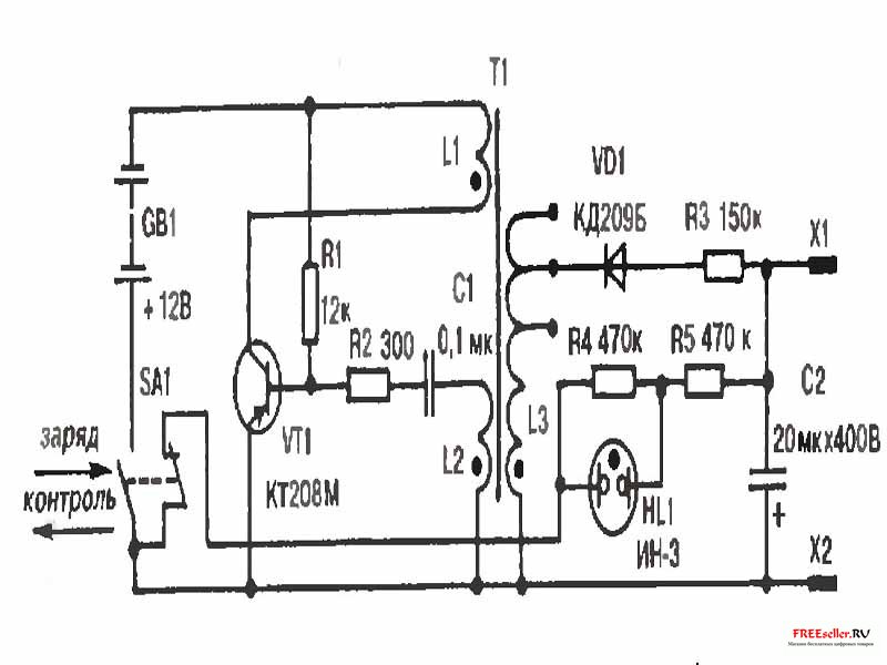 Что касается отладки устройства, то ее предпочтительно проводить при подключении к батарее с заведомо большей емкостью, чем у штатной, либо к сетевому адаптеру. Напряжение на электродах Х1, Х2 должно составлять 290—300 В. Отсутствие его при включенном питании указывает на наличие ошибок, допущенных во время монтажа. Чаще всего по причине перепутывания низковольтных обмоток трансформатора при пайке. В таком случае достаточно поменять местами выводы у L1 или L2. Когда генератор работает, напряжение на выходе достигает установившегося значения, как уже отмечалось, через 8—10 секунд. Если контрольный замер покажет, что это время не выдерживается, то требуемого результата добиваются подсоединением к наиболее подходящему отводу обмотки L3.