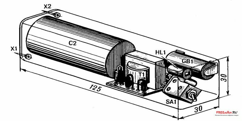Накапливаемый здесь 300-вольтный заряд и служит ударной силой, способной нейтрализовать агрессора. Разряд происходит, когда электроды XI, Х2 соприкасаются с кожным покровом нападающего. Судить о готовности устройства к действию позволяет неоновый индикатор HL1, подключаемый к конденсатору С2 тумблером SA1 в положении КОНТРОЛЬ. ![]()